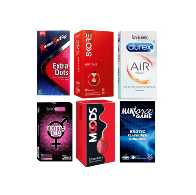 • Flavour 6: Air 10s + Manforce Game 10s + Skore Not Out 10s + Nottyboy 3in1 + Kamasutra Extra Dots 10s + Moods Strawberry 12s